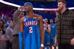 本场比赛,亚历山大出战39分钟,投篮18中13,三分5中2,罚球8中7,拿到35分6板9助2抢断3盖帽,正负值+12全队最高!