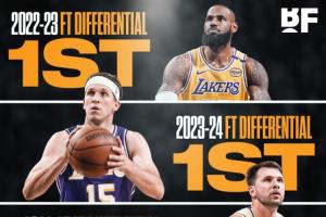 体育资讯03月17日讯 据统计,截至今日赛前,湖人与对手的罚球差近4个赛季第3次领跑联盟。