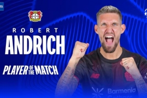 体育资讯3月12日讯 欧冠1/8决赛首回合,勒沃库森主场1-1战平阿森纳,安德里希首发出战,赛后被评为全场最佳。